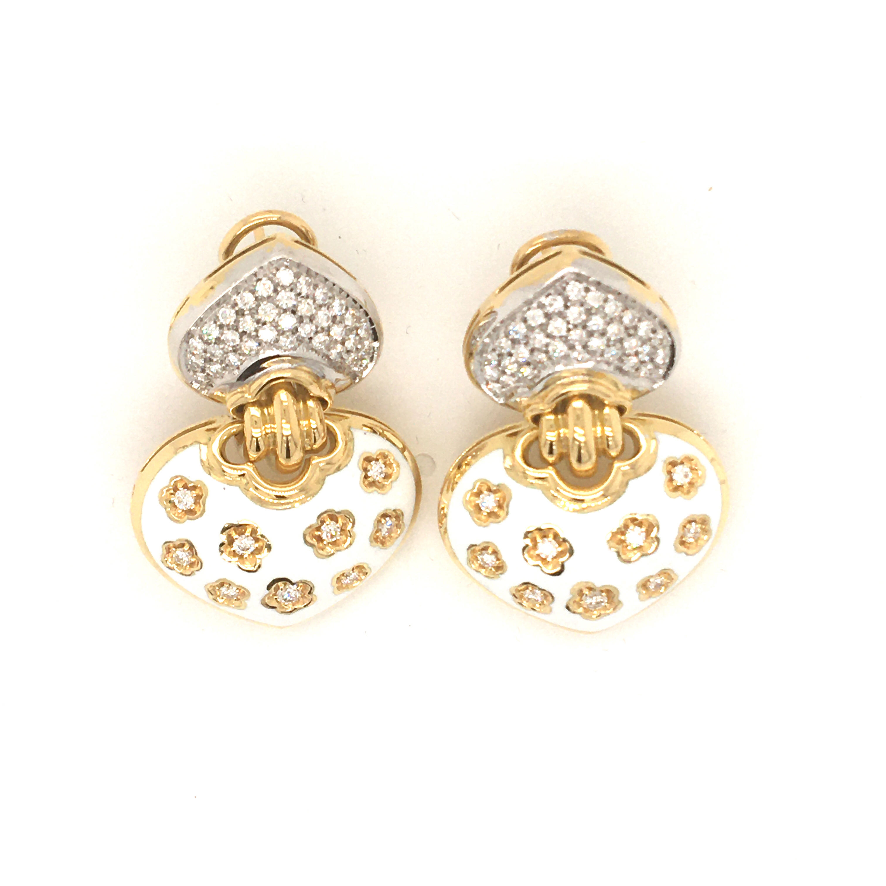 Yellow and white gold earrings with translucent enamels and natural diamonds